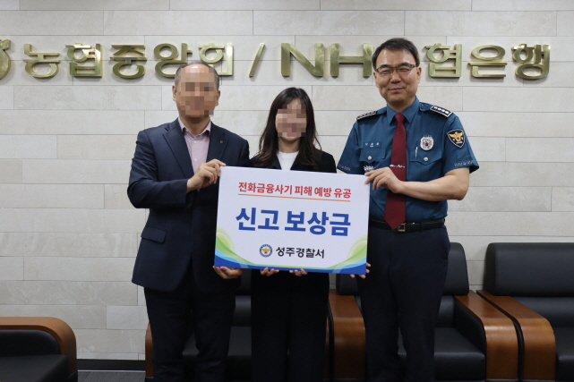 성주경찰서, 보이스피싱 예방 금융기관 직원에 감사장 및 신고보상금 전달【경상포커스=전상철기자】성주경찰서(서장 이규종)는 17일 보이스피싱 사기 피해를 예방한 NH농협은행 성주군지부 정아름 과장에게 감사장과 신고보상금을 전달했다.
