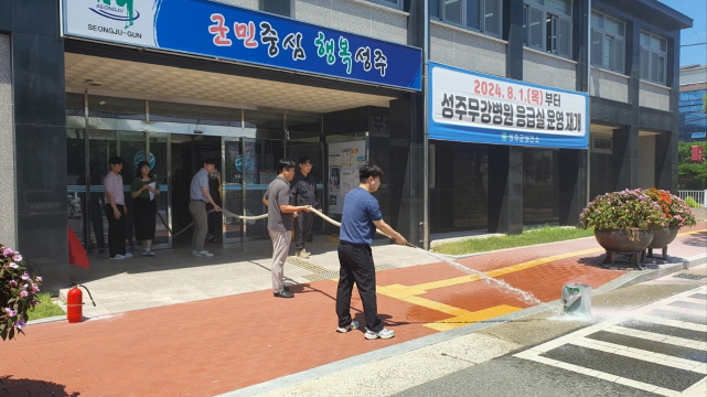 이번 합동훈련은 화재에 대한 경각심을 높이고 신속한 대응 능력을 향상시키기 위해 진행됐으며, 성주군보건소 2층 사무실에 화재가 발생한 상황을 가정해 성주소방서와 합동으로 실시했다.