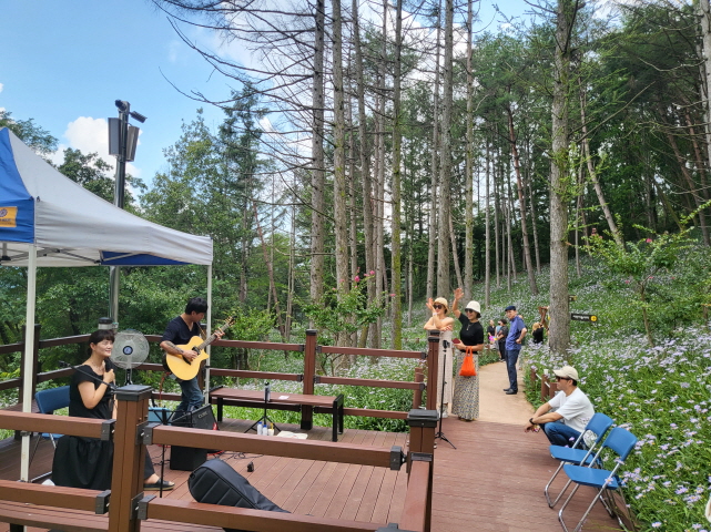 주말 가야산을 찾은 등산객들과 가족단위 관람객들이 만개한 벌개미취 군락지에서 시원한 숲바람을 느끼며 가야산 야생화 버스킹을 통해 잠시나마 일상의 짐들을 잊어버리는 시간이 됐으면 한다