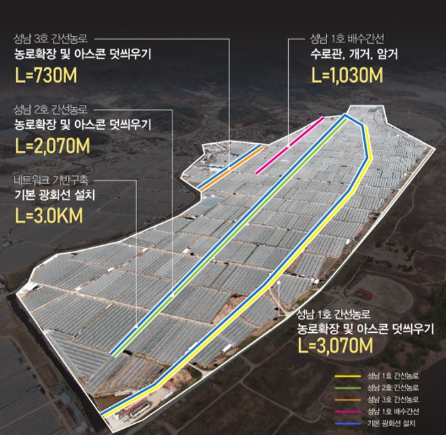 성주군은 본 사업으로 선남면 도흥1리 외 4개리 일원 122ha에 총 36억을 투입해 2025년부터 2027년까지 3년 동안 용배수로 정비, 농로 확포장, 통신시설 설치 등 스마트팜 기반시설을 확충할 예정이다 이는 참외무인방제기, 무인관수관비시설 등에 원활한 용수를 공급하고 스마트 기자재 작동을 편리하게 함으로써 농업 생산성 향상 및 농가 수익 증대, 청년 농업인 유입을 목표로 하고 있다.