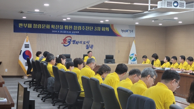 칠곡군은 올 한해 총 3번의 청렴추진단 회의를 통해 청렴시책 추진상황을 점검하고, 부패취약분야 분석 및 개선전략을 공유하는 등 청렴도 향상을 위한 다양한 의견을 주고받는 시간을 가졌으며, 청탁금지법, 이해충돌방지법 등 청렴 관련 법령에 대한 주요 내용을 파악함으로써 간부공무원의 청렴 이해도를 높였다.