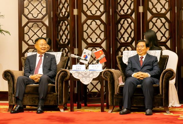<사진>김재욱 칠곡군수(왼쪽)가 중국 하남성 제원시 서의현 당서기(오른쪽)와 환담을 나누고 있다.=칠곡군 제공