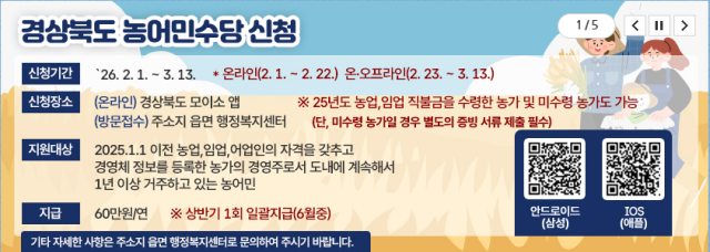 경상북도 농어민수당은 농가당 연 60만 원이 지급되며, 자격 요건 검증과 심의 절차를 거쳐 상반기 중 지역사랑상품권 또는 지역사랑선불카드 형태로 지급될 예정이다.