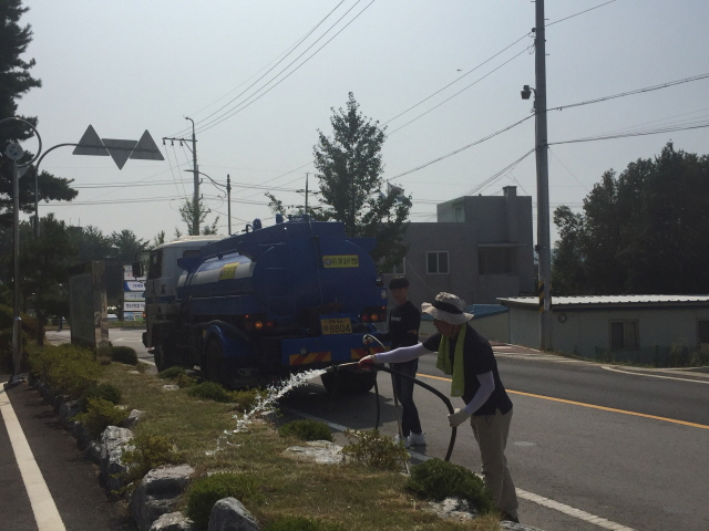㈜흥일개발은 7월말부터 연일 무료로 살수차를 운영해 인구밀집지역과 도로를 비롯해 주변 가로수와 화단, 밭작물에 물을 공급중이다.
