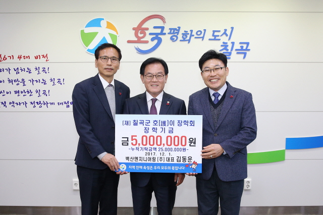 벽산엔지니어링(주) 김동운 대표는 지역인재육성과 교육발전을 위해 써달라며 (재)칠곡군호이장학회에 호이장학금 500만원을 기탁했다.고 3일 밝혔다.